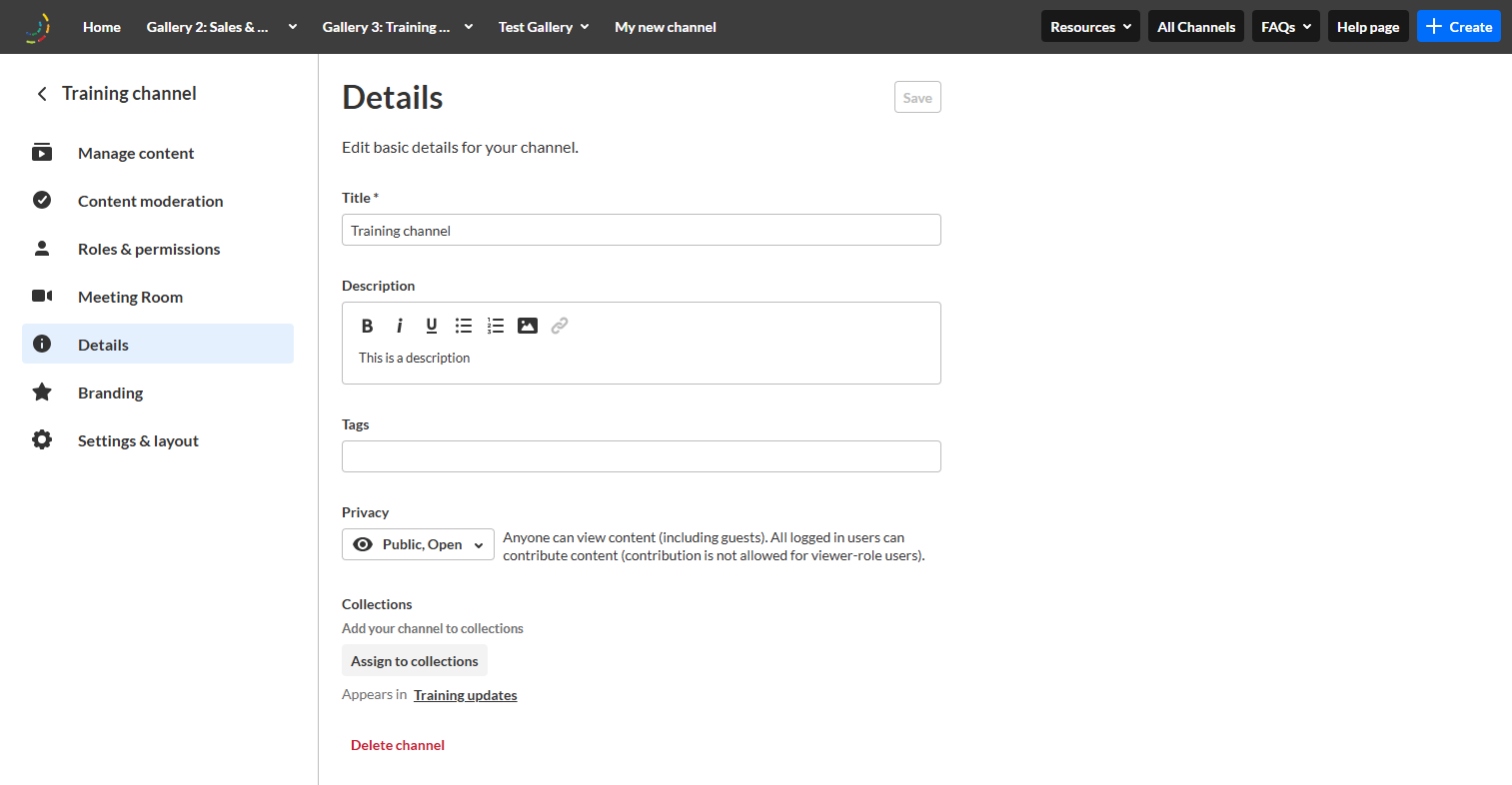 You can update your channel’s basic information and visibility from the Details tab. This includes editing the channel name and description, setting privacy options, and deleting the channel if it’s no longer needed.