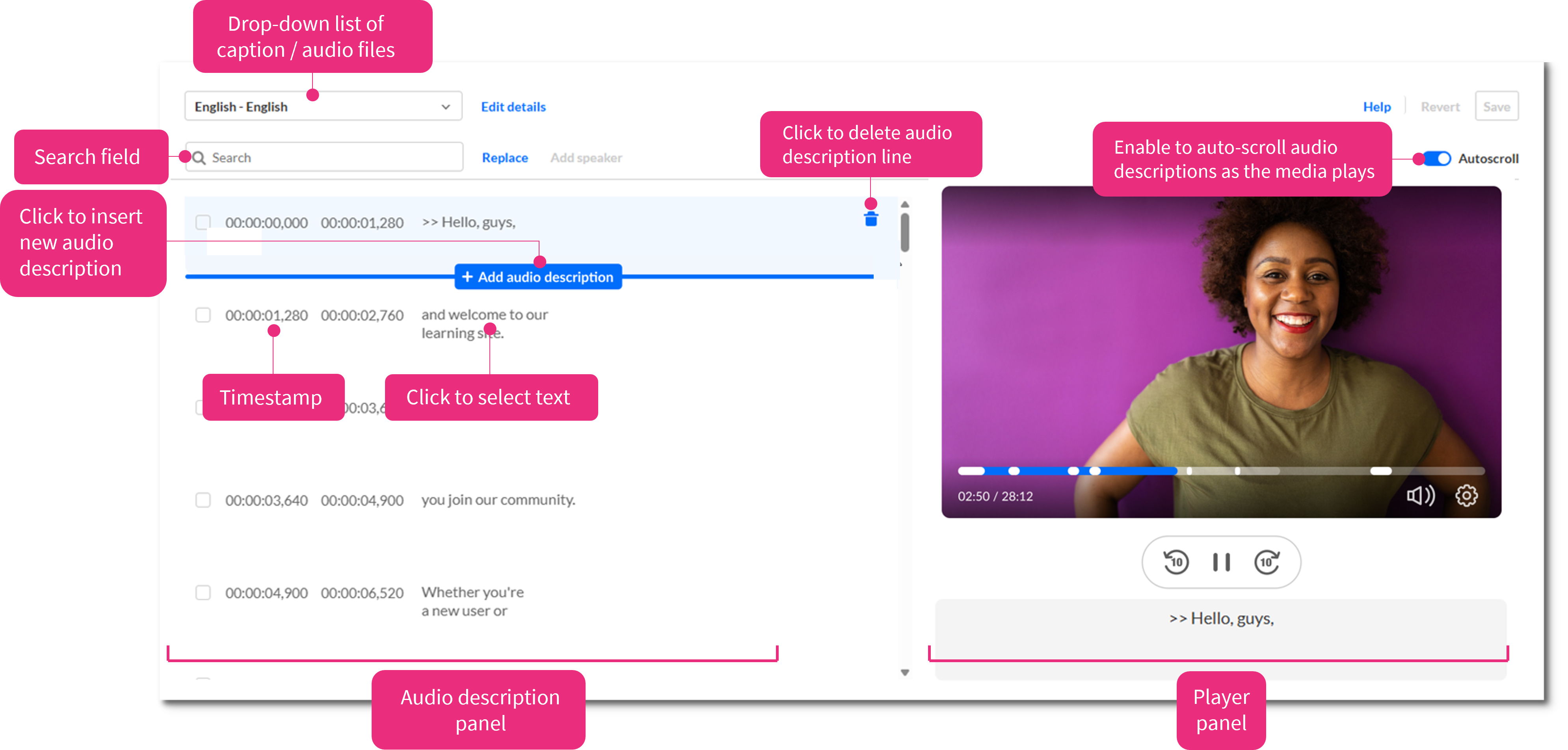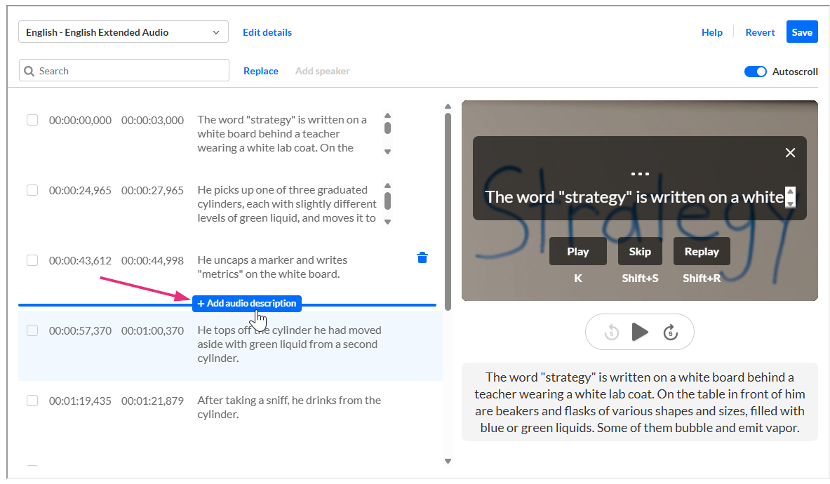 - Autoscroll - Click 'Autoscroll' to automatically follow the audio descriptions while the media plays. Delete cue - When you hover over a cue, a trash can icon appears. Click the icon to delete the cue.