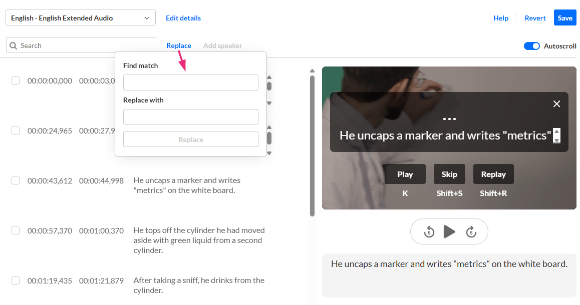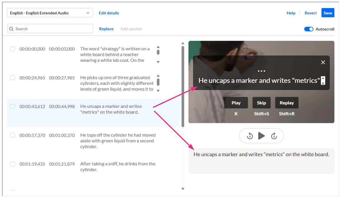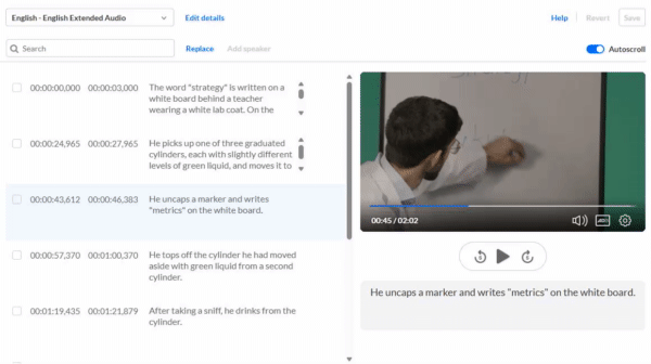 The editor also includes helpful tools like auto-scroll, timestamp editing, and search and replace, making it easy to fine-tune extended audio descriptions and support accessible viewing.