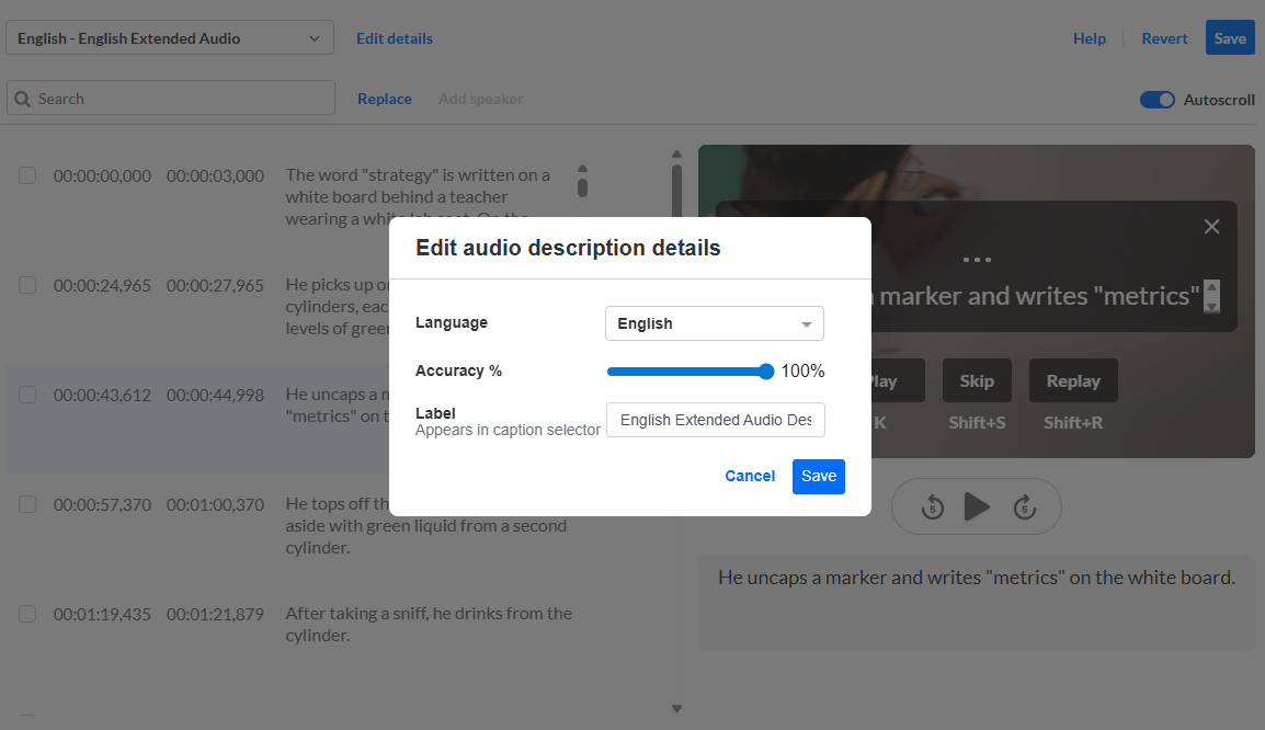 You can easily edit the text and timing, and your changes are saved automatically. A preview mode lets you listen to the audio description during playback, so you can check how it sounds as you work.