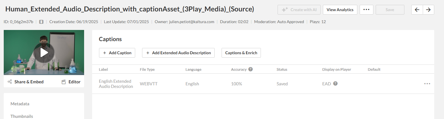 The extended audio description editor lets you review and edit extended audio descriptions for your videos in KMC. If a video has more than one extended audio description file, the editor opens the one you selected.