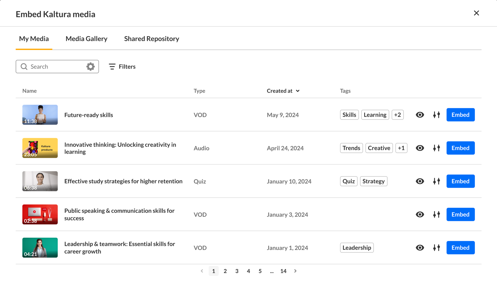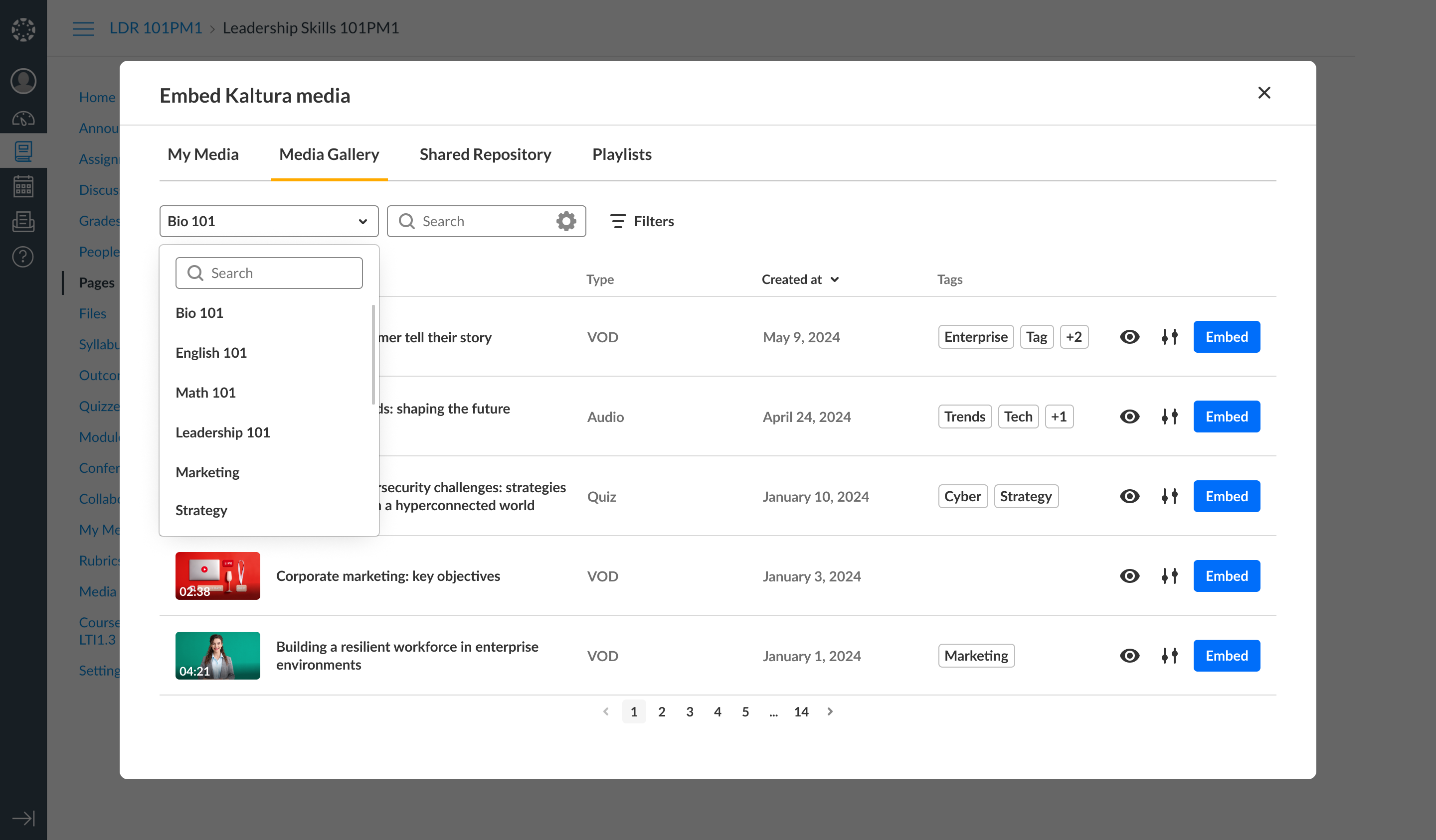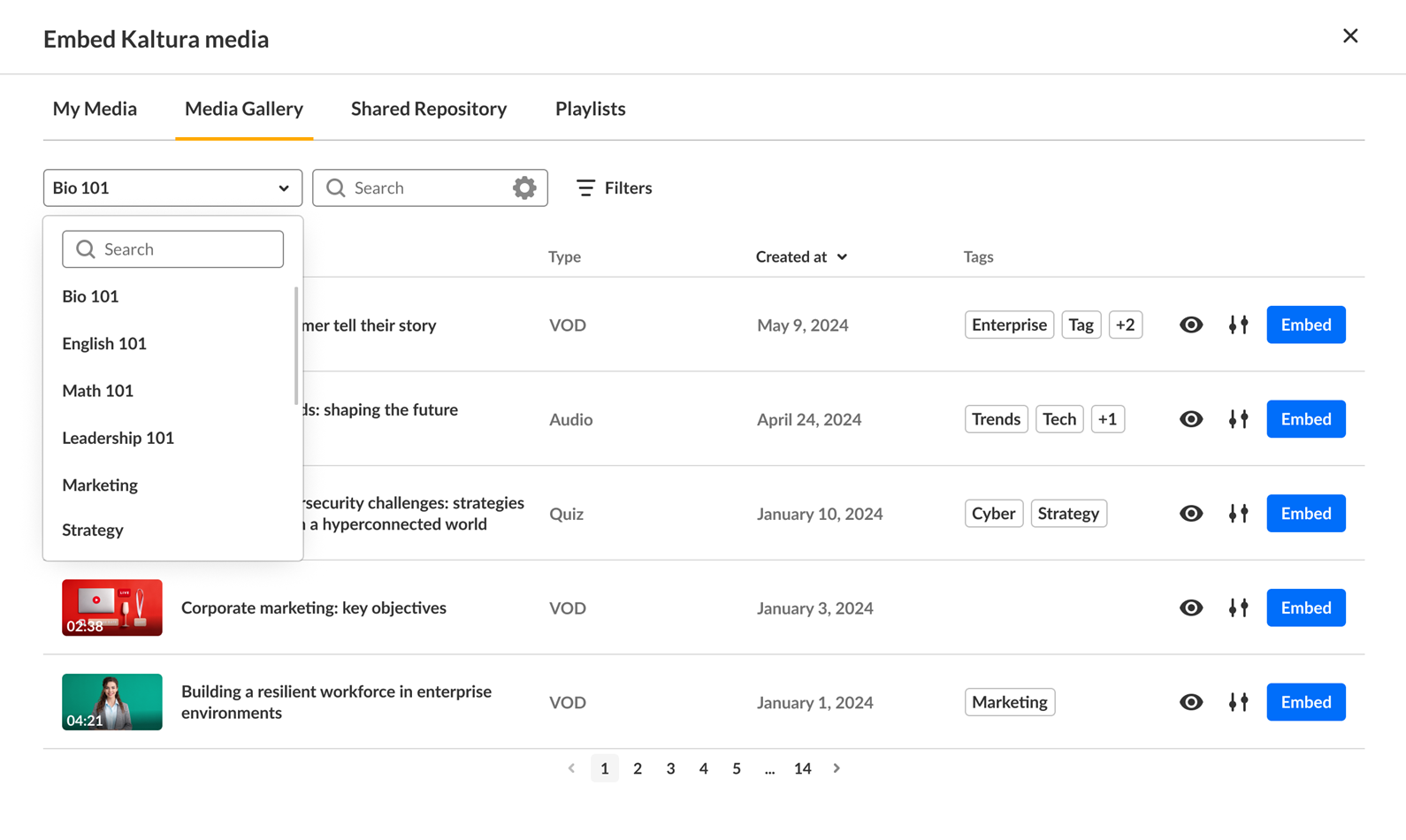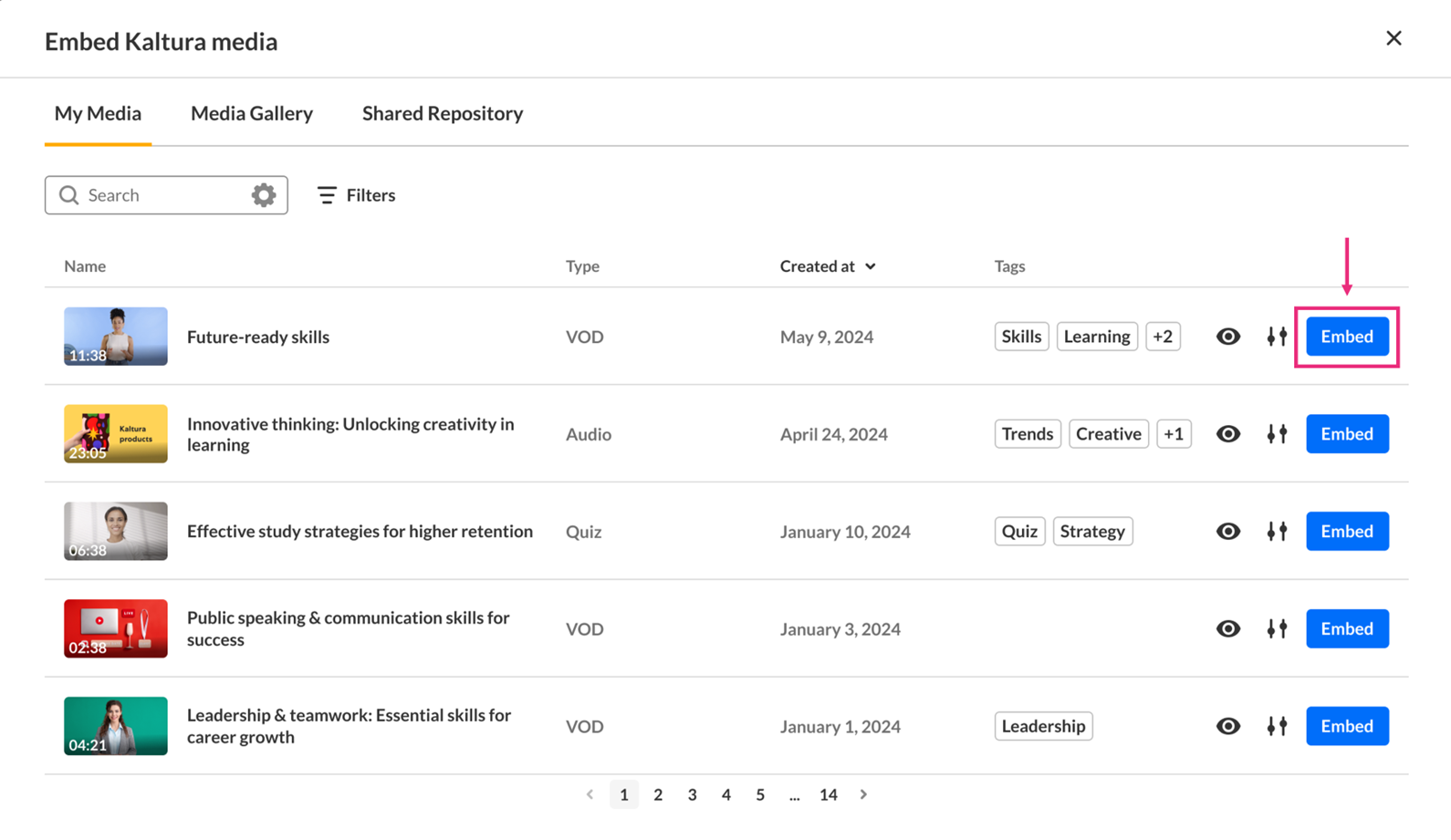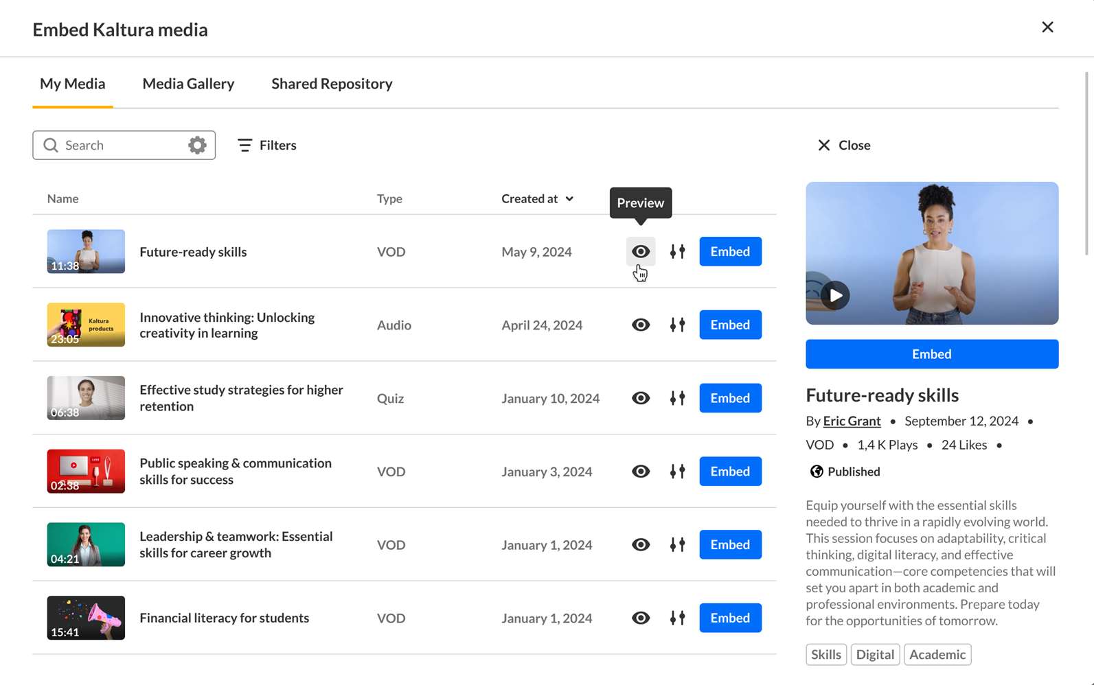 1. In the Embed Kaltura Media window, locate the media you want to insert and click Embed.