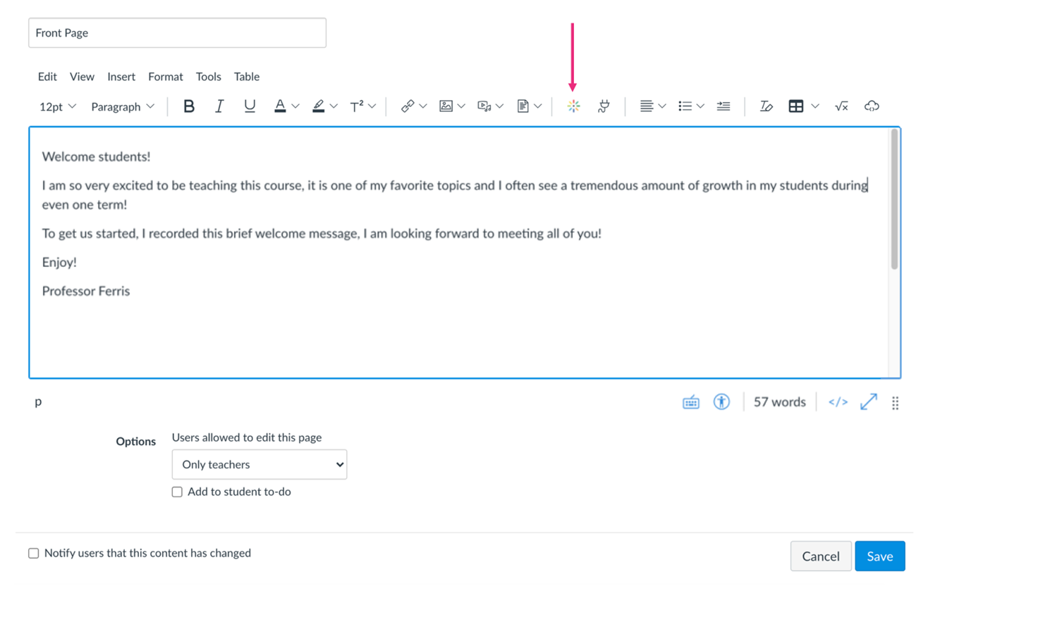 - Navigate to the area where you want to embed media, such as Announcements, Discussions, or Assignments.