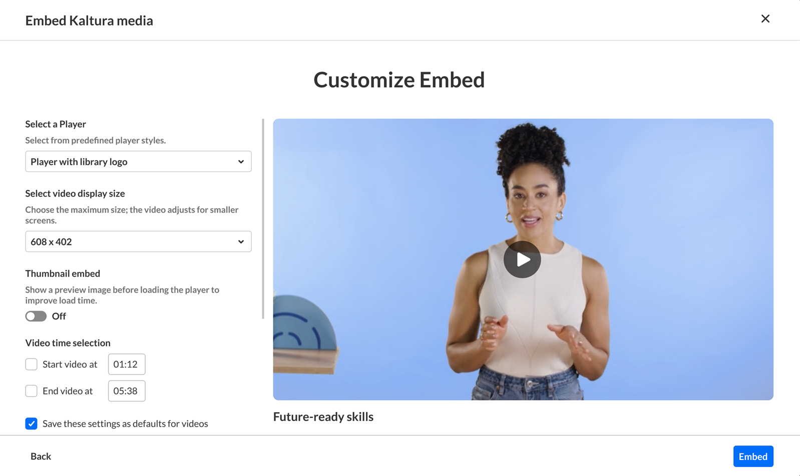 Save these settings as default - Enable this option to apply the same settings automatically to future embeds of this media type.
