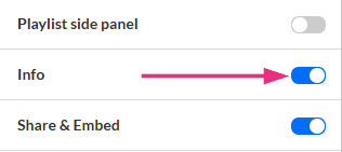 Enable this option to have an information icon display in the upper right corner of the player. When a user clicks on the icon, additional information about the video is displayed.