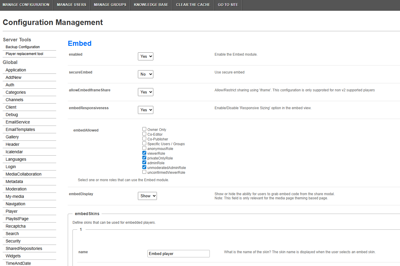 embedSkins - Define skins that can be used for embedded players. When configured, the Player Skin options are displayed.