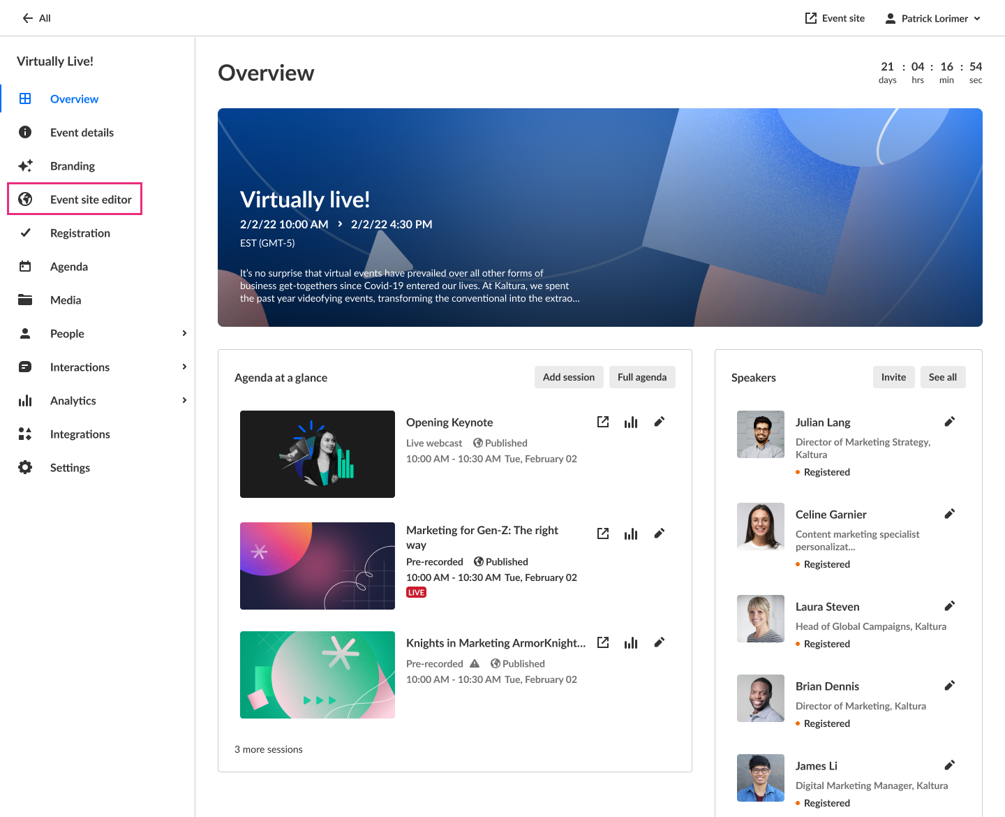 After creating a new event, navigate to the Event site editor page; from the Event page, click the Event site editor tab.
