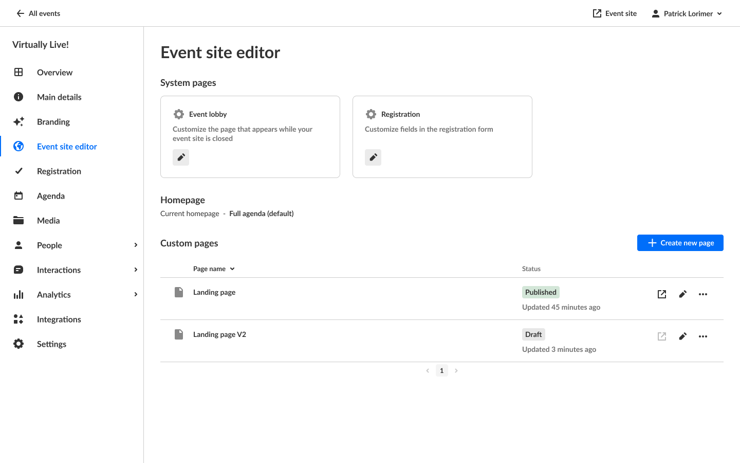 The Event site editor page displays. In our example below, the two system pages are displayed - Event lobby and Registration - and two custom pages that have already been built are listed as well - Landing page and Landing page V2.