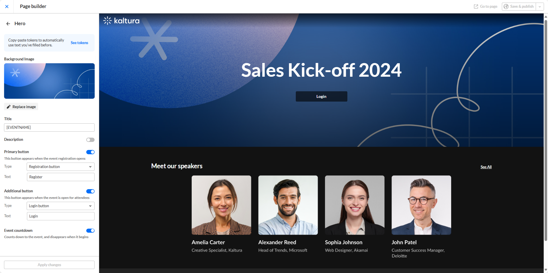- Build custom pages to better customize and control the structure of your event. Admin can use this powerful design tool to create as many different pages as they want, styled with unique components, creating different experiences based on their audience. They can choose to make these pages public, or only available to a select group of authenticated users. They can also choose to set one of these custom pages as the event home page.