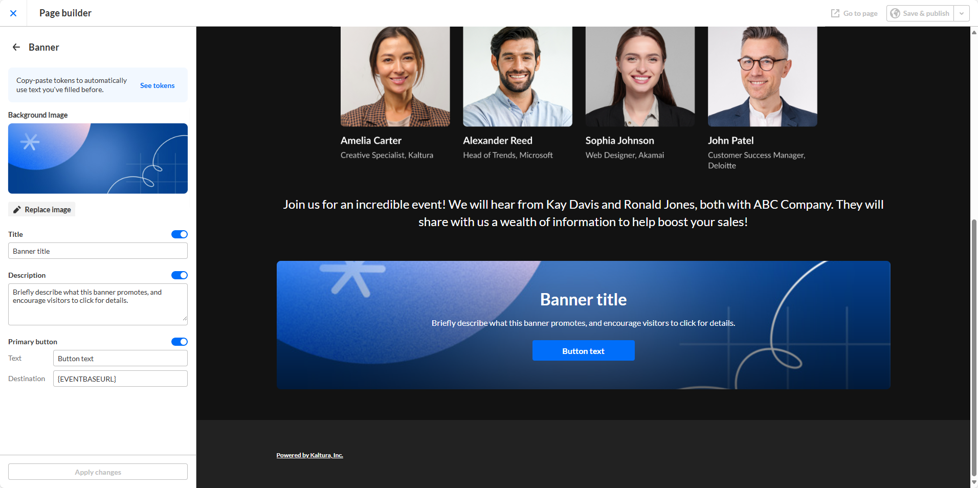 Right image - The default event banner is taken from the template initial setup. If you wish to insert a different image, click Replace image and choose the desired file. (Recommendation: 16:9 ratio, 854 x 480 px)