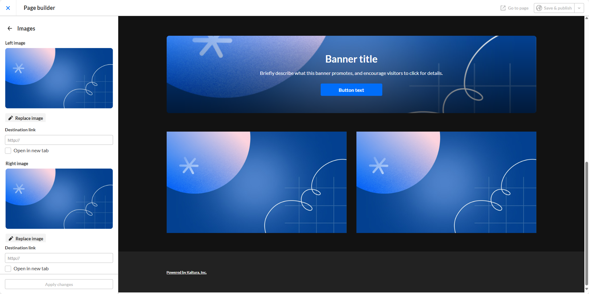 Images - Two clickable images that are side-by-side, one on the left and one on the right. (Recommendation: 16:9 ratio, 854 x 480 px) Clicking on the images can redirect attendees inside the event site or out of it.