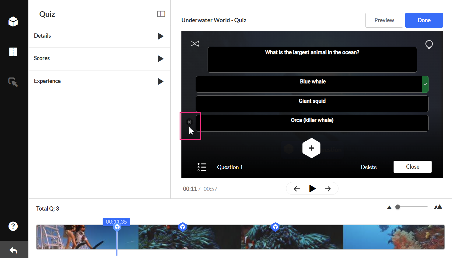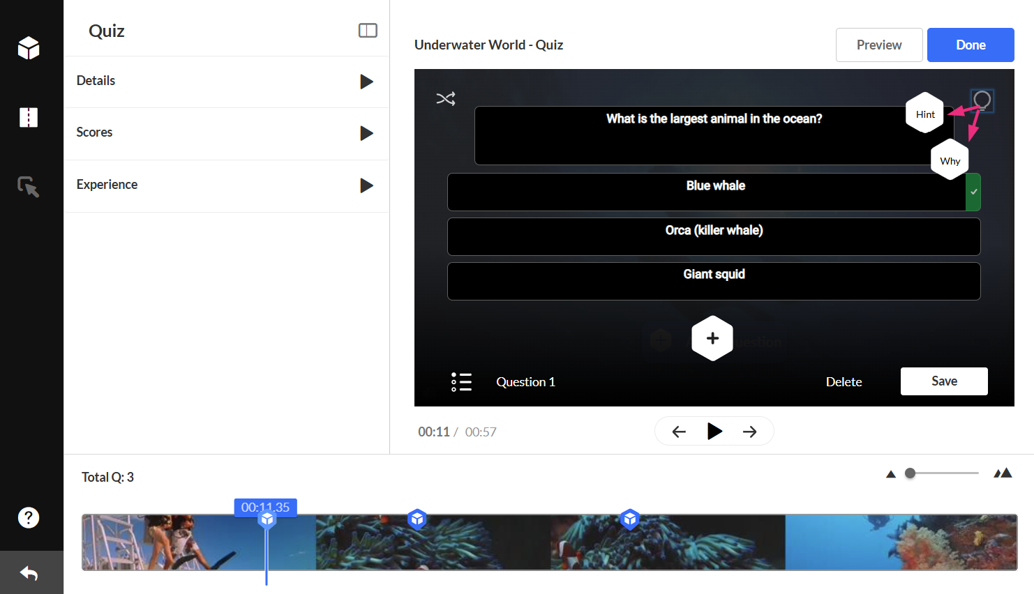 Hover over a question icon to preview it, or click to edit. Drag the icon to change its position on the timeline.