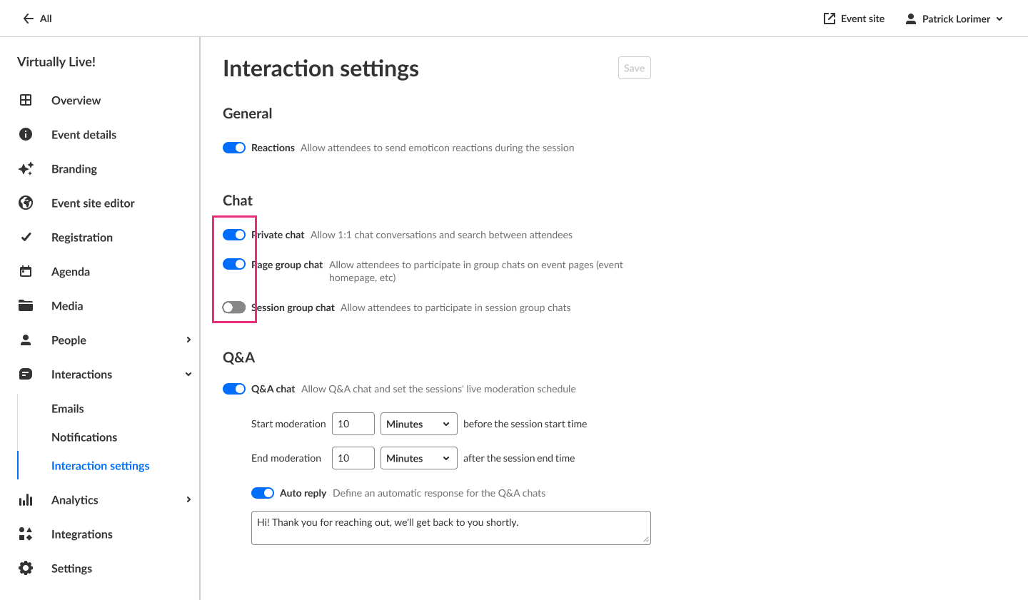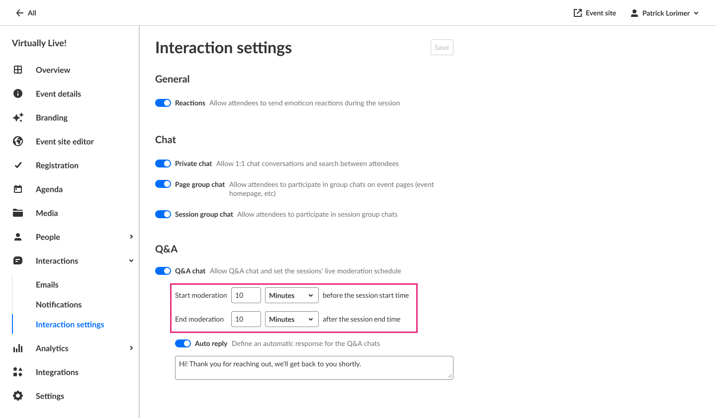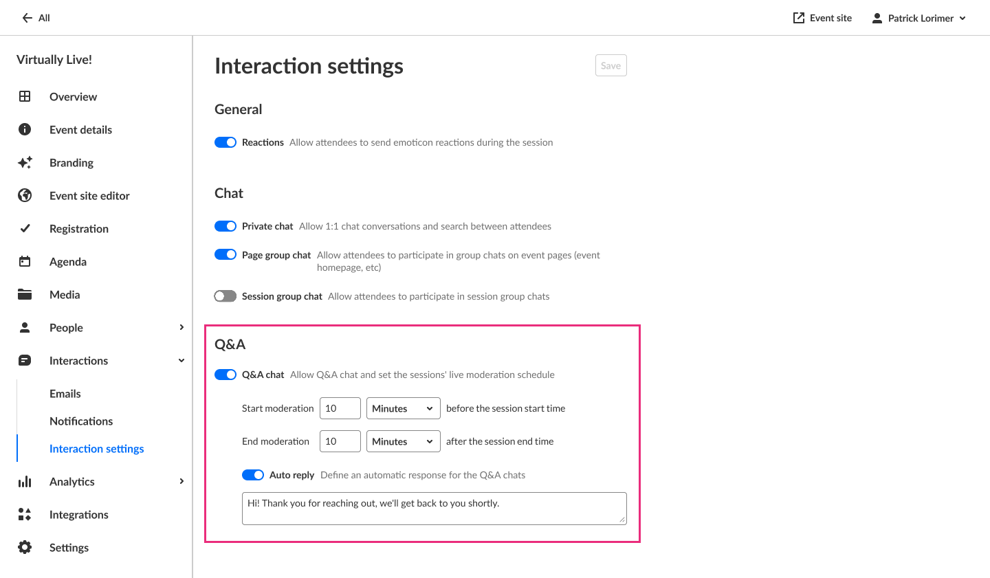 - Enable or disable Q&A chat. If Q&A chat is enabled, organizers can also set the sessions' live moderation schedule and define an automatic response for the Q&A chats.