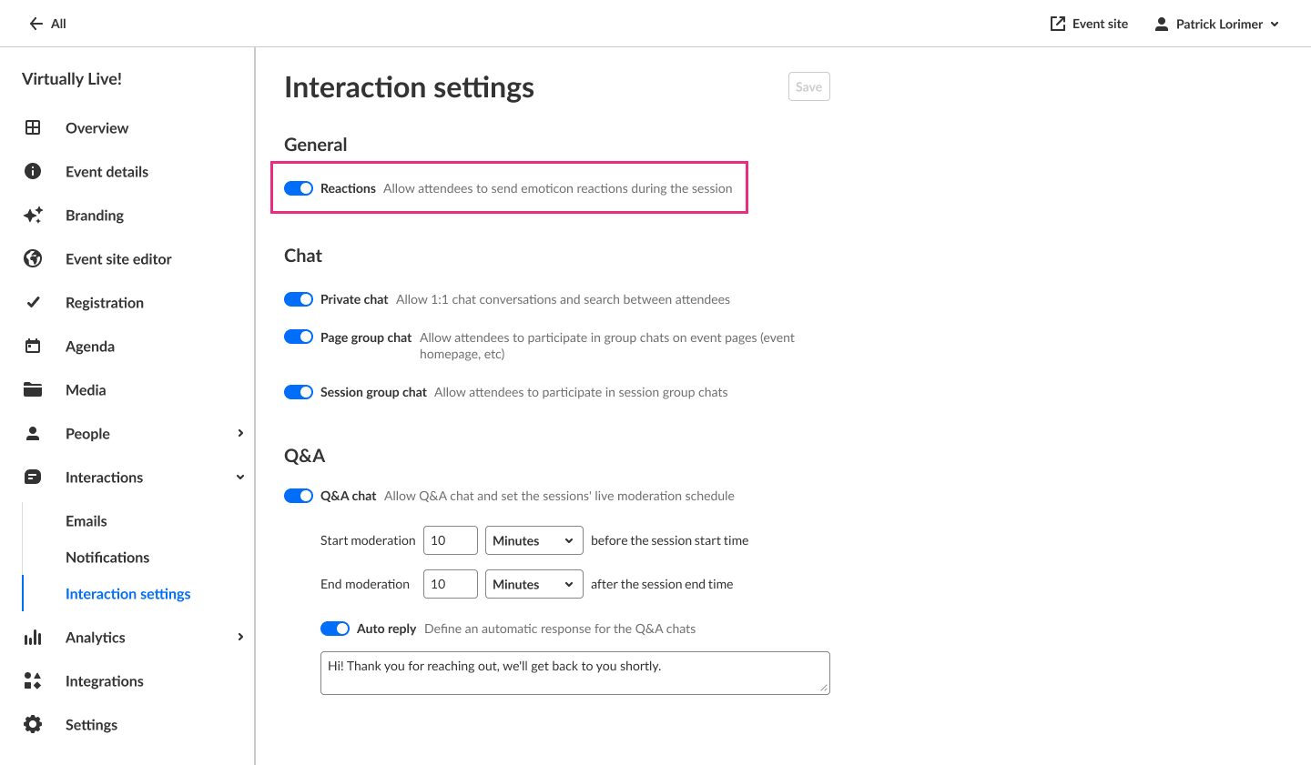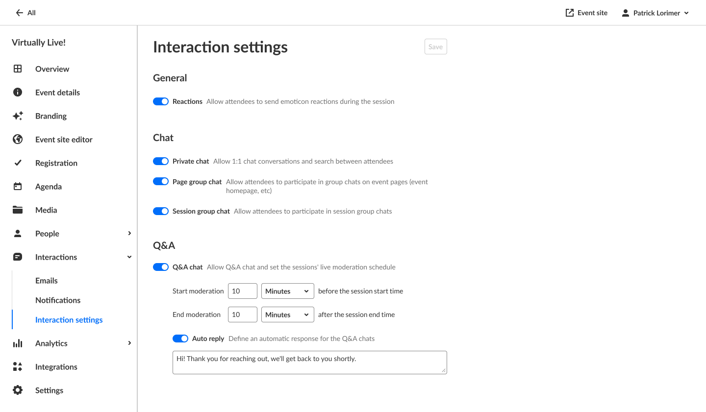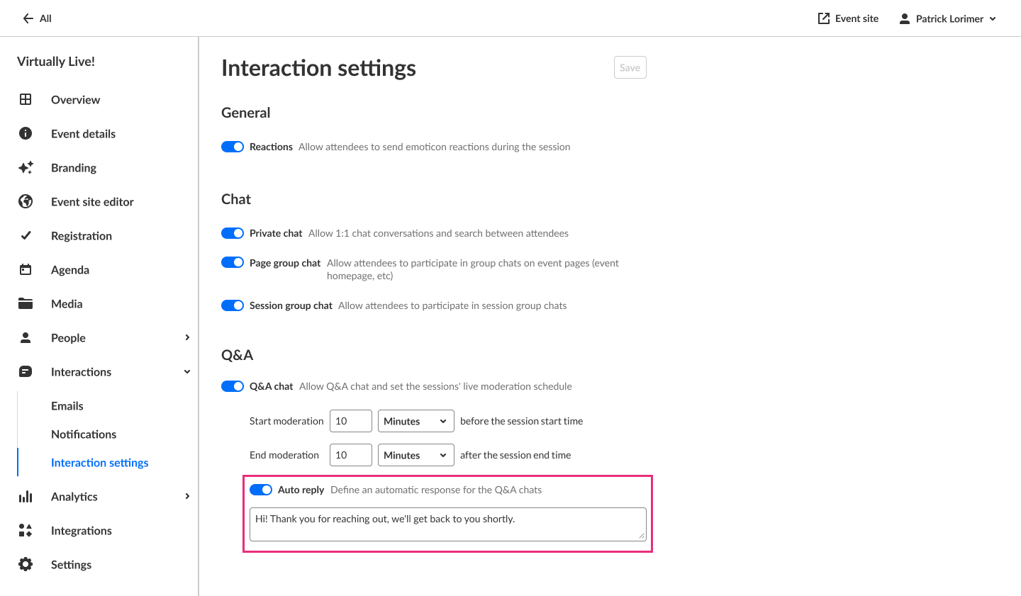 - Enable or disable Q&A chat. If Q&A chat is enabled, organizers can also set the sessions' live moderation schedule and define an automatic response for the Q&A chats.