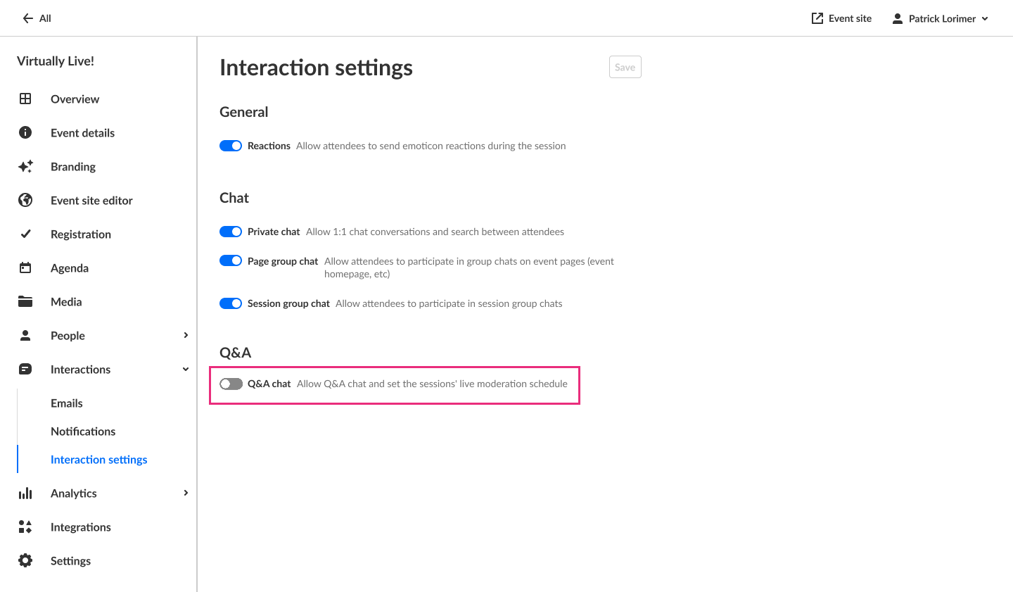 Q&A chat is enabled by default. As shown below, the feature is enabled when the blue toggle button is the "On" position.