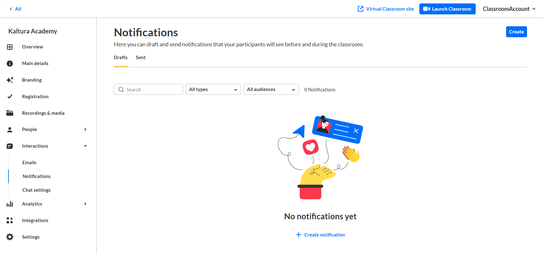 The Notifications page allows you to create and manage notifications for your virtual classroom.