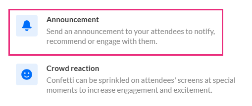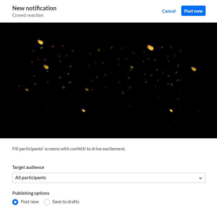 - Crowd Reaction - Use this notification to sprinkle confetti on attendees' screens at special moments to increase engagement and excitement.