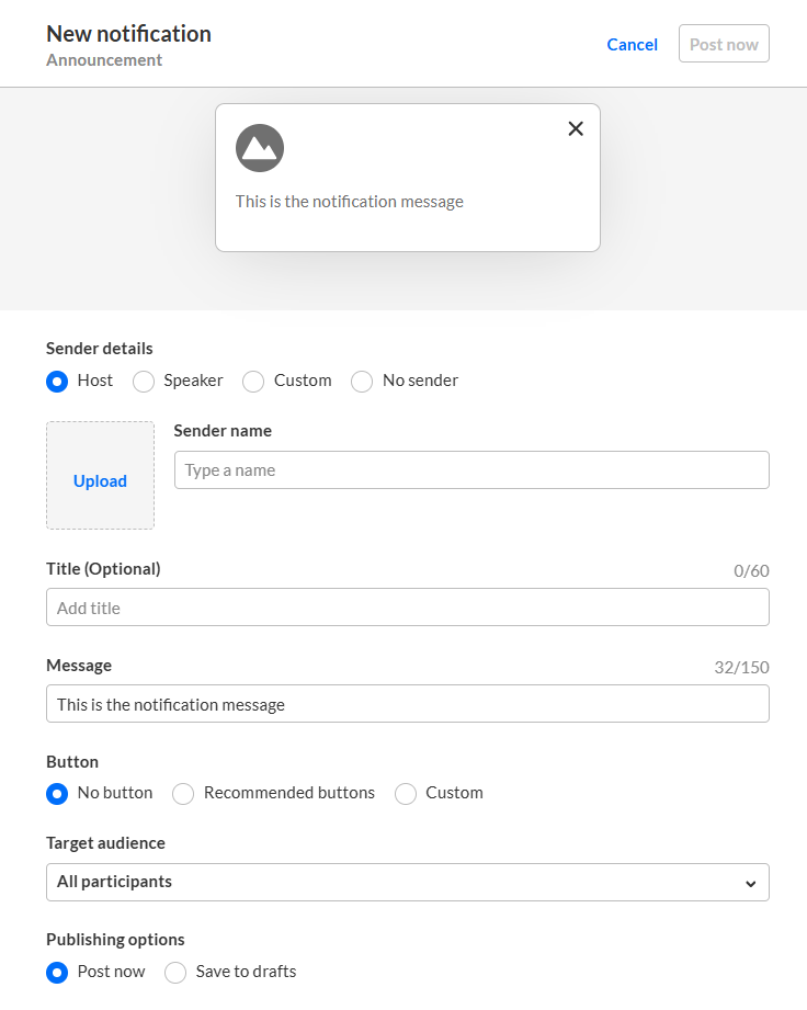 - Announcement - Use this notification to send an announcement to your attendees to notify, recommend, or engage with them.