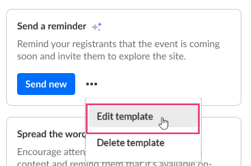 - On the Templates tab, under Custom templates, choose Edit template from the three-button menu located in the desired custom email box to edit the custom template before sending.