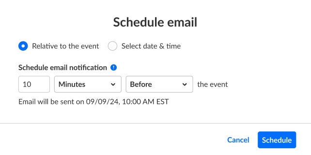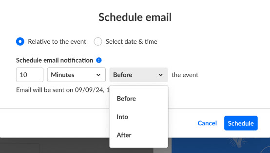 - Decide whether you would like to schedule the email relative to the event (i.e., at a chosen amount of time before, into, or after an event), or on a specific date and time.