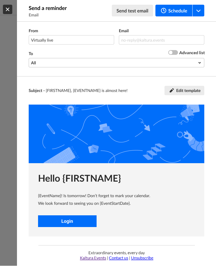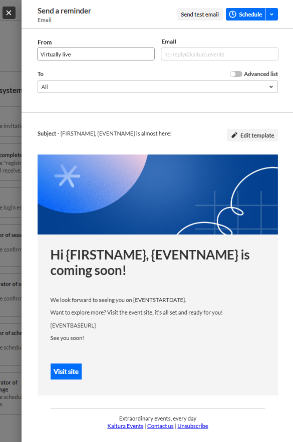 On our preset event templates, Kaltura provides six custom email templates that event organizers can use to build custom emails for prospects, registrants, and attendees. You can edit and use them as basis for your email or create new ones.