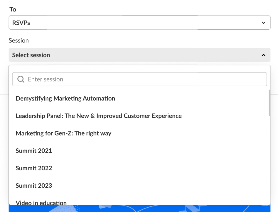 You want to send an email to those who were invited and/or registered but did not attend, telling them they were missed and directing them to the recording. Choose Invited and Registered. - If you selected RSVPs, you are required to select one session from a list of existing sessions on the agenda, thereby streamlining communication with those who have RSVPed to a specific session at the time of sending. Click on desired session.