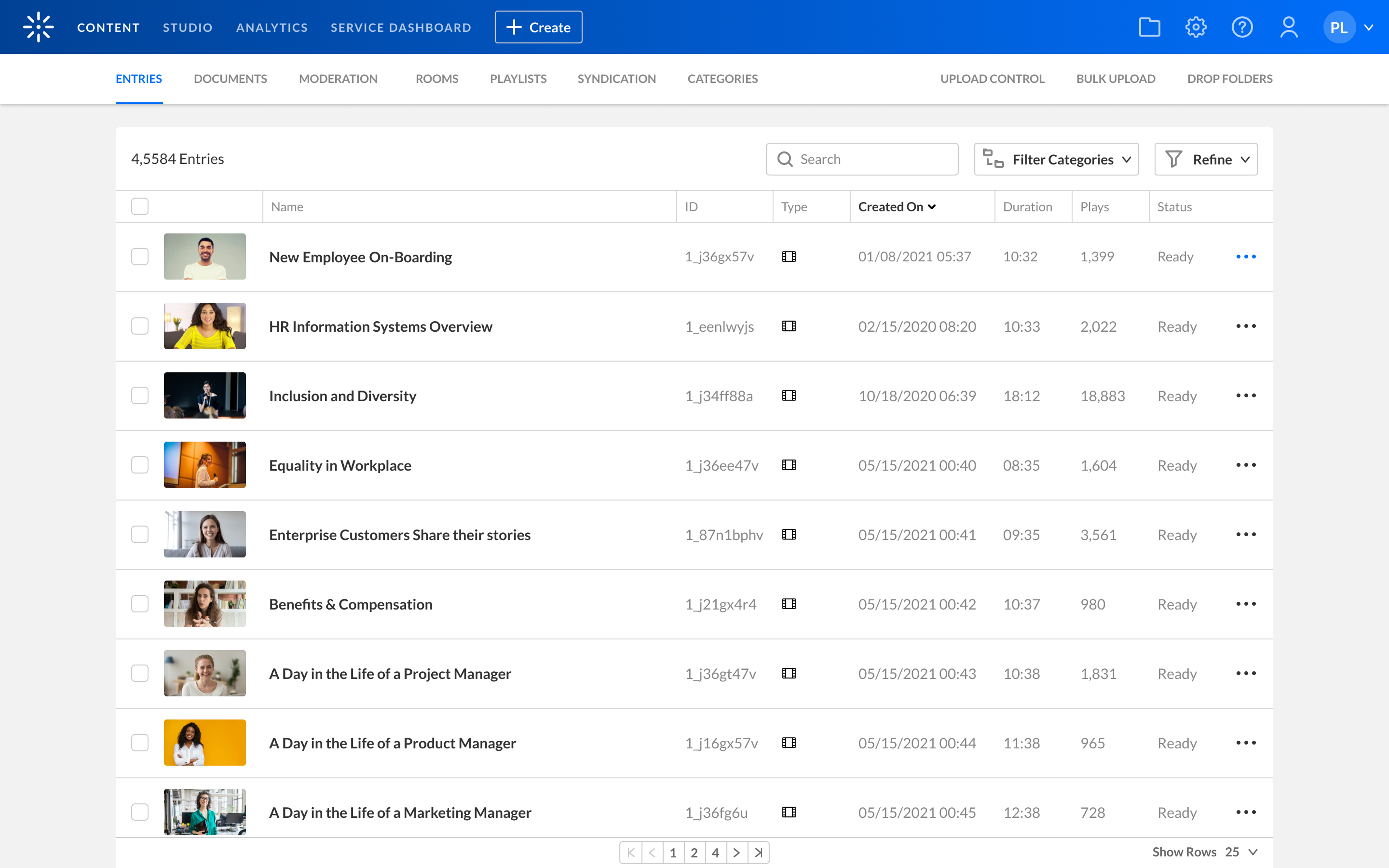 Content is organized into categories (similar to folders in a library) and can be shared within Kaltura applications. The root categories have a logical structure reflecting the front-end applications available in your account, such as Kaltura Event sites, LMS platforms, and Kaltura's Video Portal.