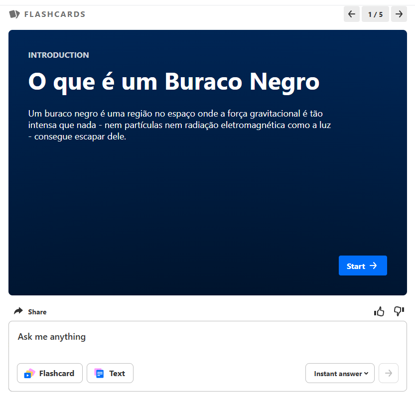 - Navigation button (flashcards) – Click 'Start' to navigate to the next flashcard in the response set.