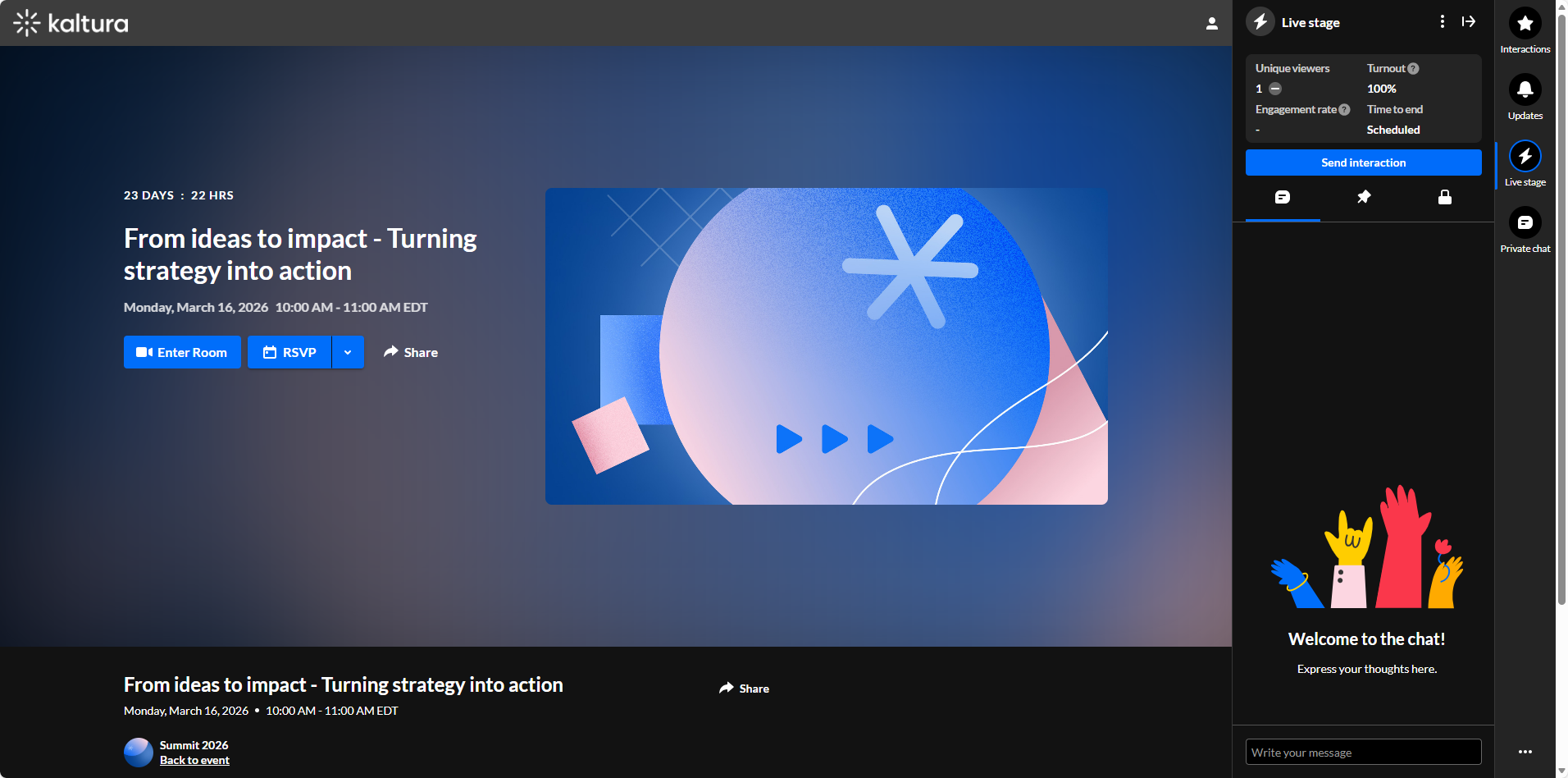 - Live Stage - View and manage public chat, Q&A, participant lists, and the main session feed in real time.