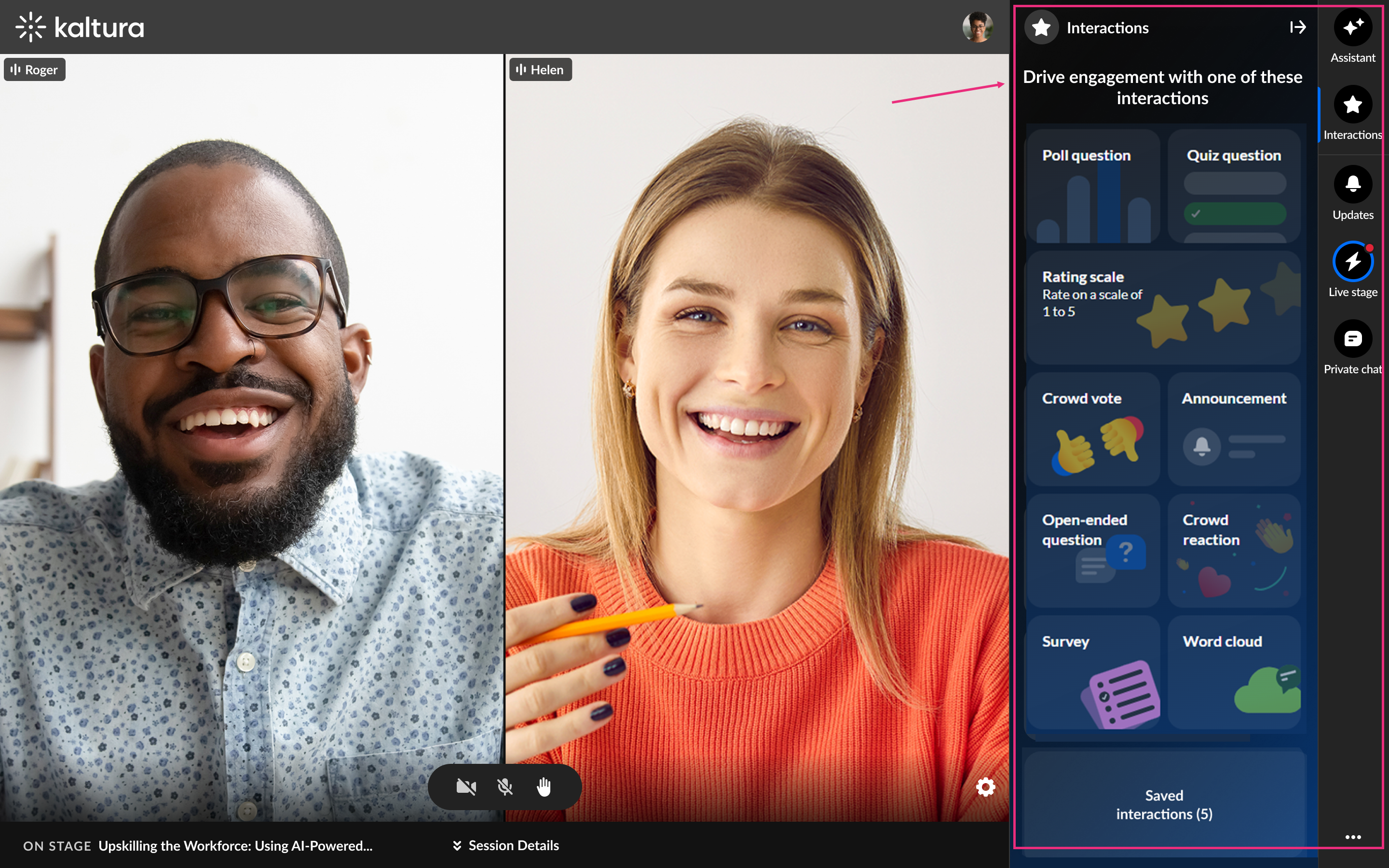 - Assistant - Monitor real-time engagement analytics and quickly launch interaction tools (polls, Q&A, etc.).