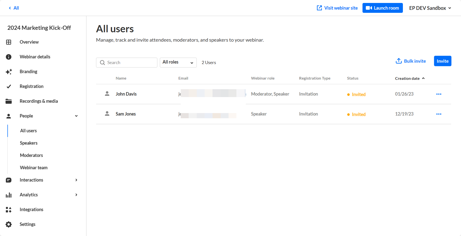 Once you have sent your invitations, you can use the Users page to view the full list of attendees for your upcoming webinar (including name, email, role, status, and creation date) and monitor their progress through the registration process.