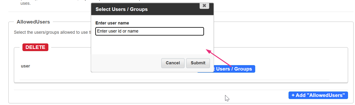To add users or groups, click +Add AllowedUsers, then select users or groups by ID or name and click Submit.
