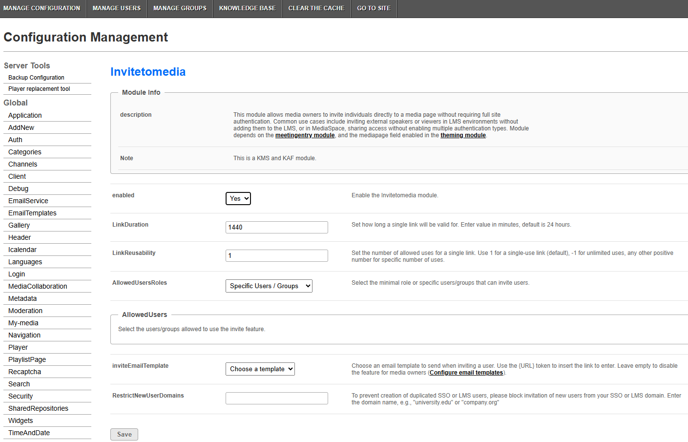1. Go to your Configuration Management console and click on the InviteToMedia module. You can also navigate to it directly using a link: https://{your_URL}/admin/config/tab/invitetomedia.