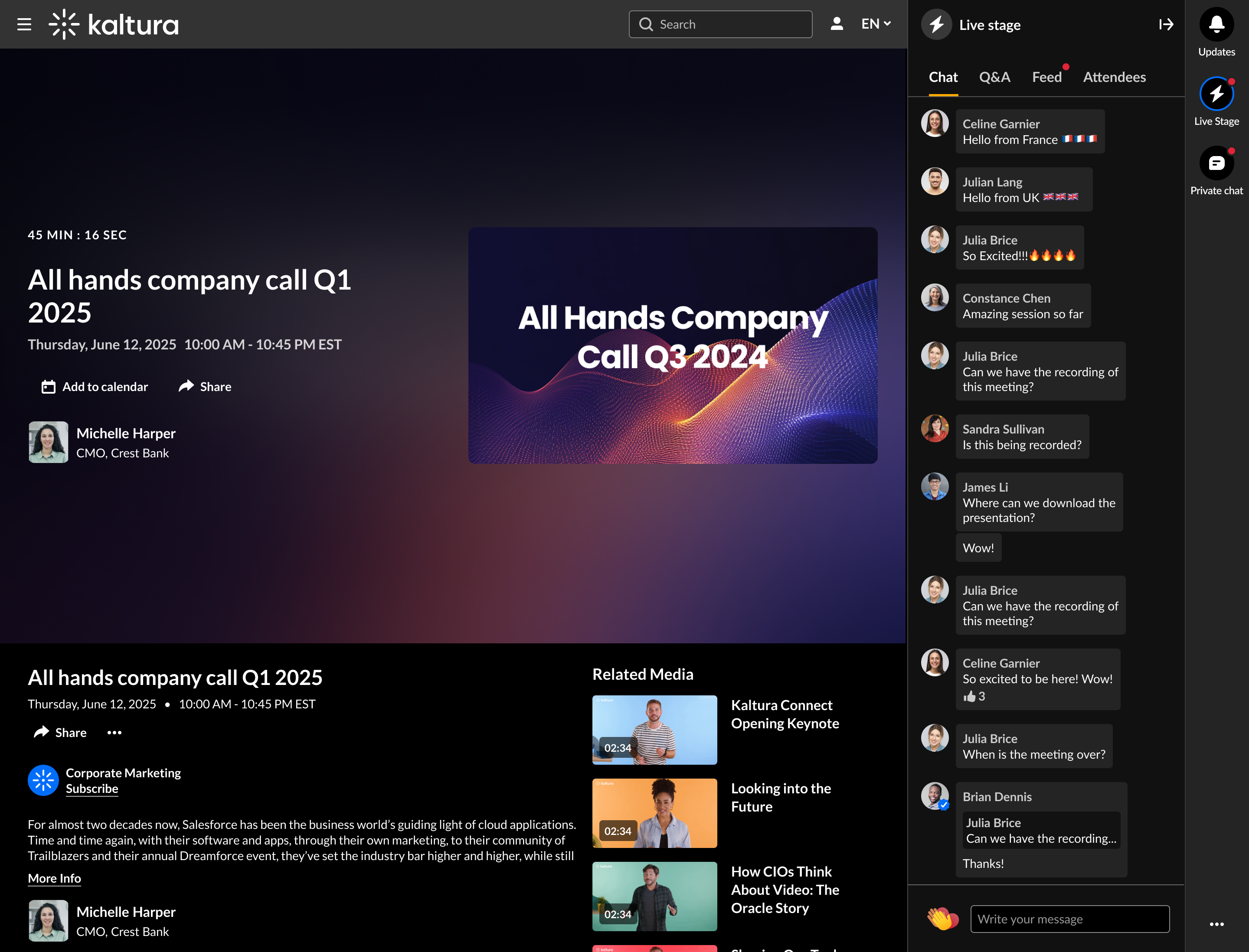 - Use engagement tools such as Chat, Q&A, and interactions such as polls and quizzes (if enabled by the event team)