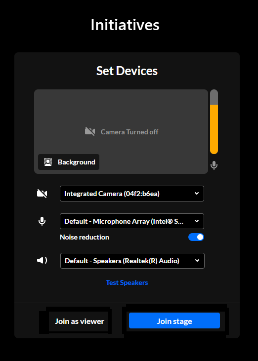 - Make any necessary adjustments to your devices, then click Join as viewer or Join stage button (as applicable) to enter the session.
