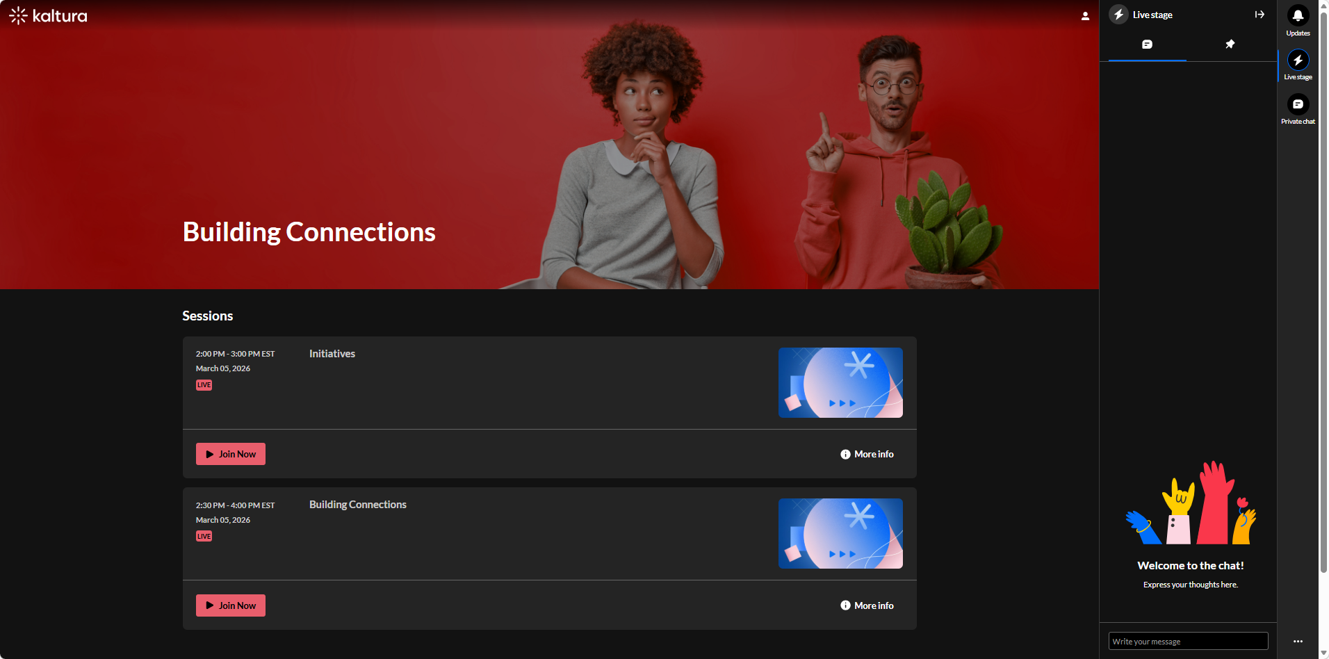 Joining a session in Kaltura Events is simple and designed to get you into live or on-demand content quickly. Whether you're attending a webinar, conference session, or virtual class, Kaltura Events provides an easy way to access sessions directly from the event site. In this guide, we'll walk you through the steps to join a session in Kaltura Events so you can connect with presenters, participate in discussions, and make the most of your event experience.