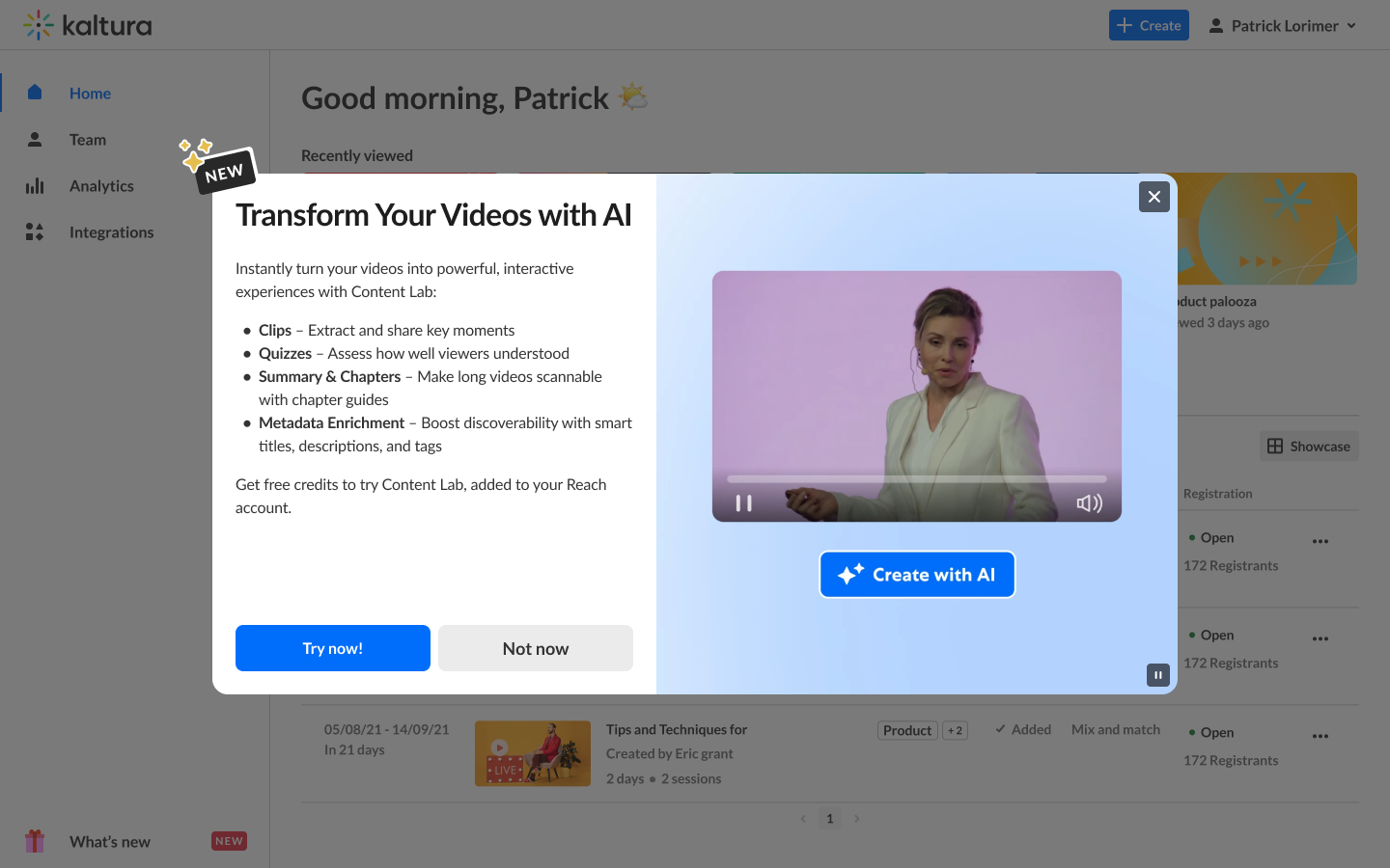 Kaltura wants to keep you in the know and involve you in our product roadmap! You may see a notification like this upon login, sharing information like a new feature or update, or asking for your vital input on a topic.
