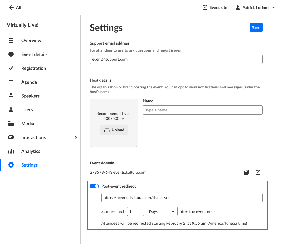 Organizers can now enable and configure a post-event redirect URL. When the event concludes, visitors to the event page will be automatically redirected to the selected destination.