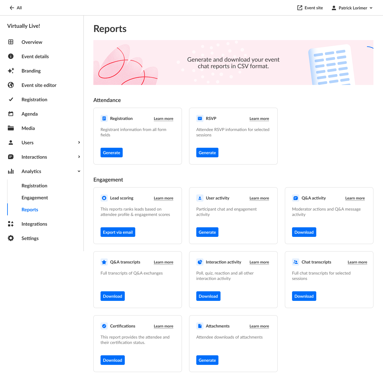 New Reports tab - A new tab designed to help event organizers easily access all available reports for their events in one convenient location. With this new page, event organizers can quickly download reports without having to navigate through different pages or modules. Each report has a link to our knowledge base, so admins can easily understand the report they are downloading and make better use of the data it provides. Read more about this new feature here.