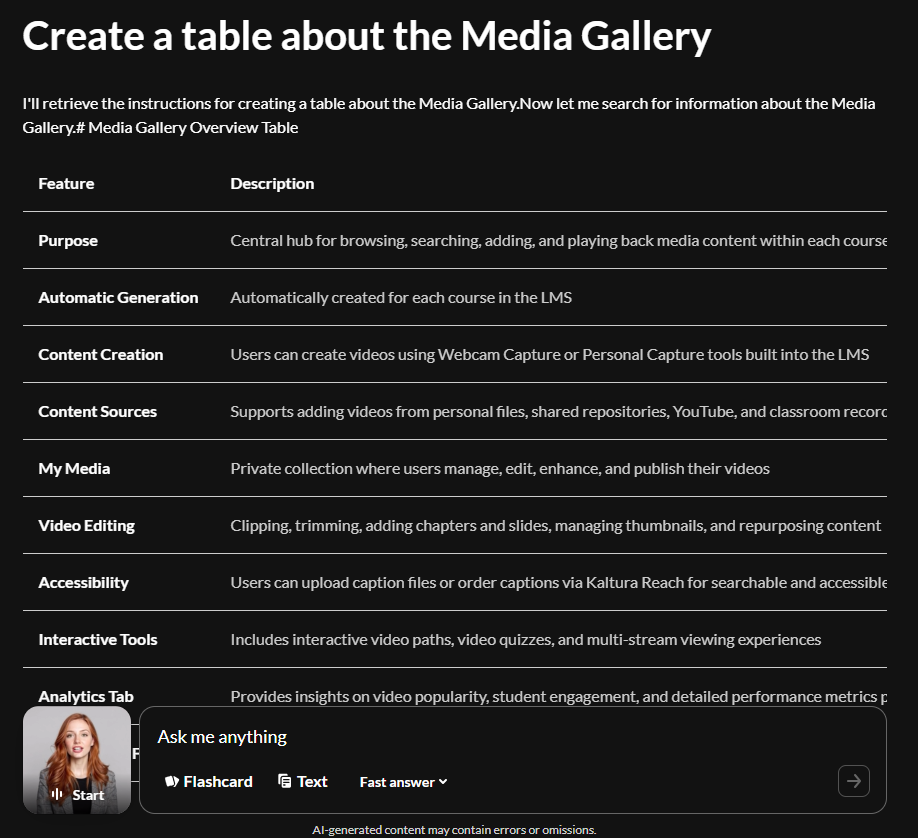 Text answers are structured for easy reading and may include lists or tables. Like flashcards, they include sources, feedback options, and follow-up suggestions.