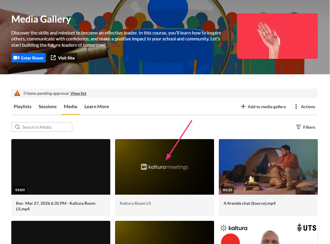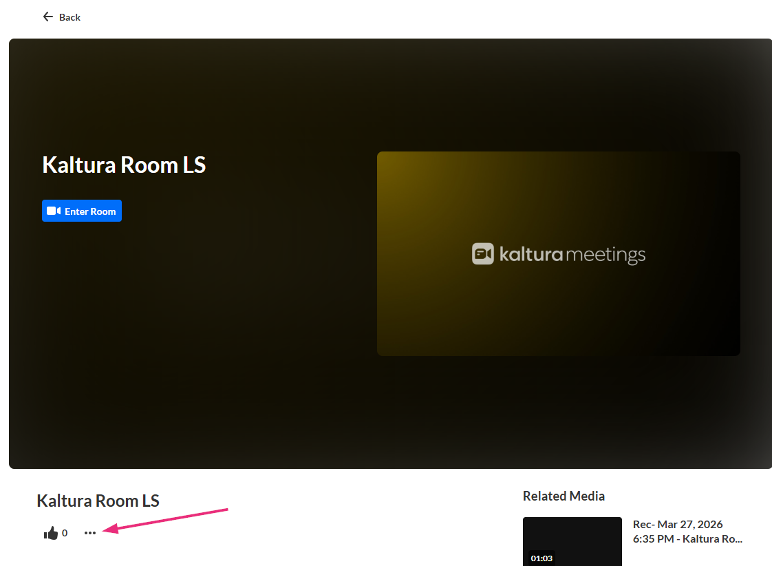 - In the Media tab, locate the Kaltura Room entry and click it.