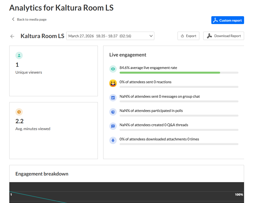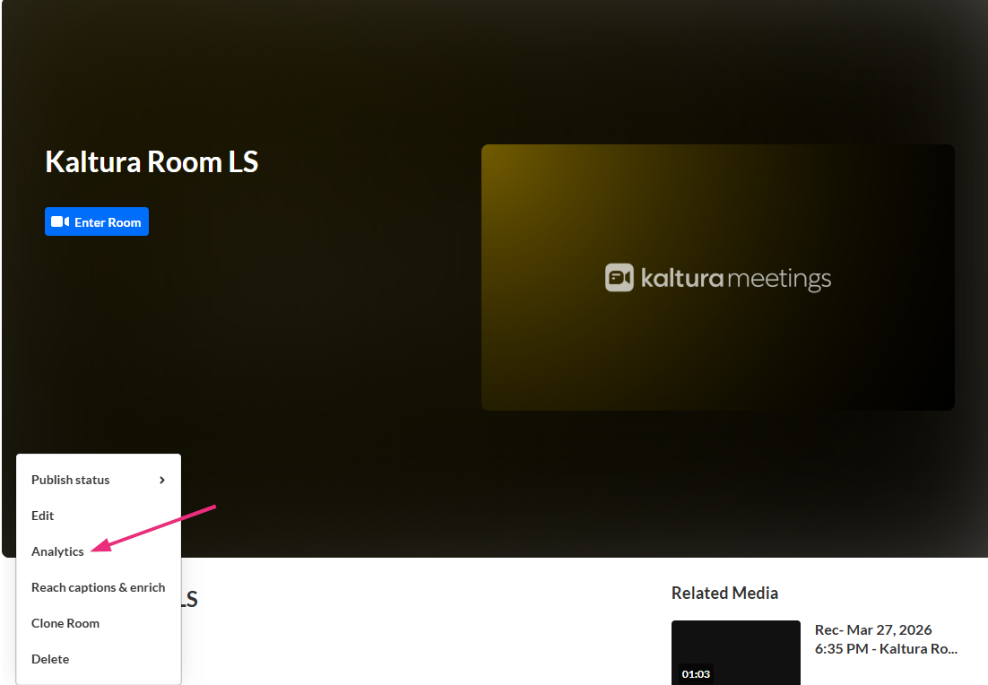 You can access analytics for a Kaltura Room directly from the Media Gallery where the room is configured. This allows instructors and administrators to review engagement and participation data for room sessions.