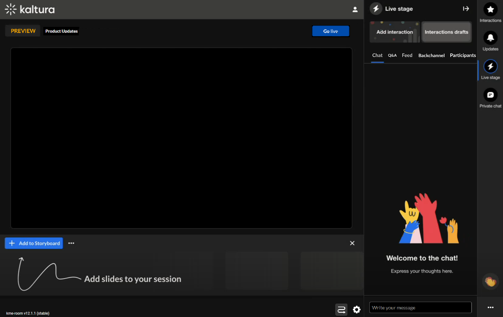 Live webcasts are orchestrated, highly produced live-streaming events for large audiences. With live webcasts you have the added flexibility of "going live" directly from a Kaltura webcast studio (if the stream has already been initiated through the encoder tool). Once a live webcast session is created in Kaltura Events, the Kaltura webcast studio is automatically created with stage ratio of a player (16:9). This gives the webcast studio user the exact experience and layout that the end users will experience as they watch the player.