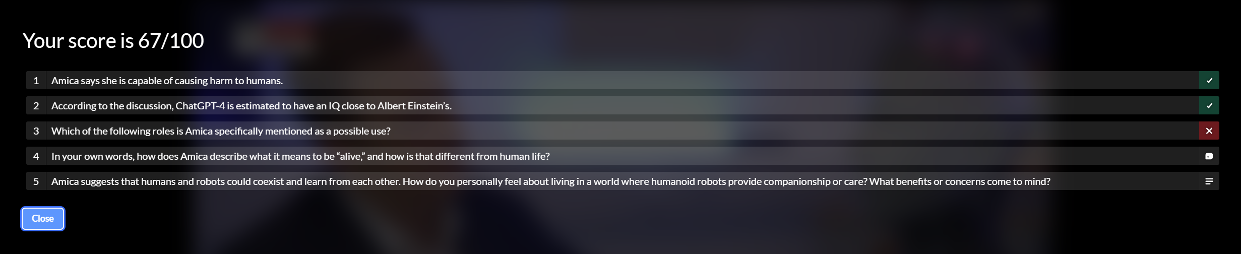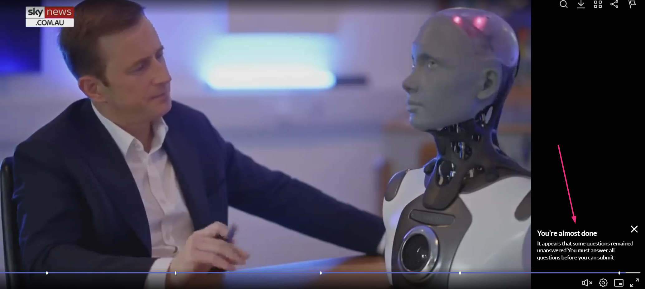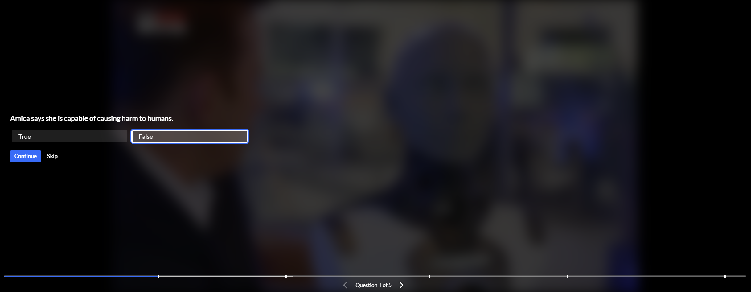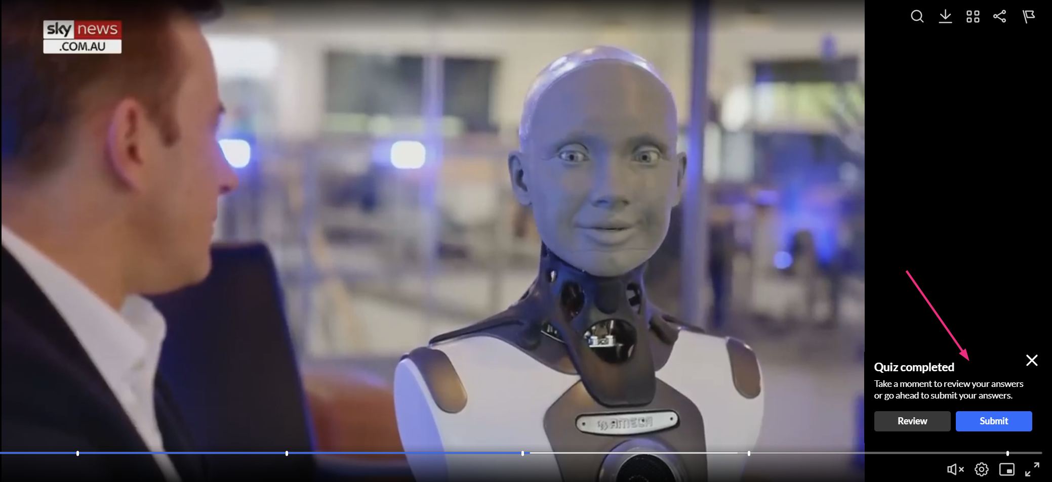After you start, the quiz opens and the video plays. The video pauses automatically when a question appears. Small white markers on the scrubber indicate where questions will appear in the video.