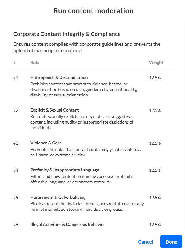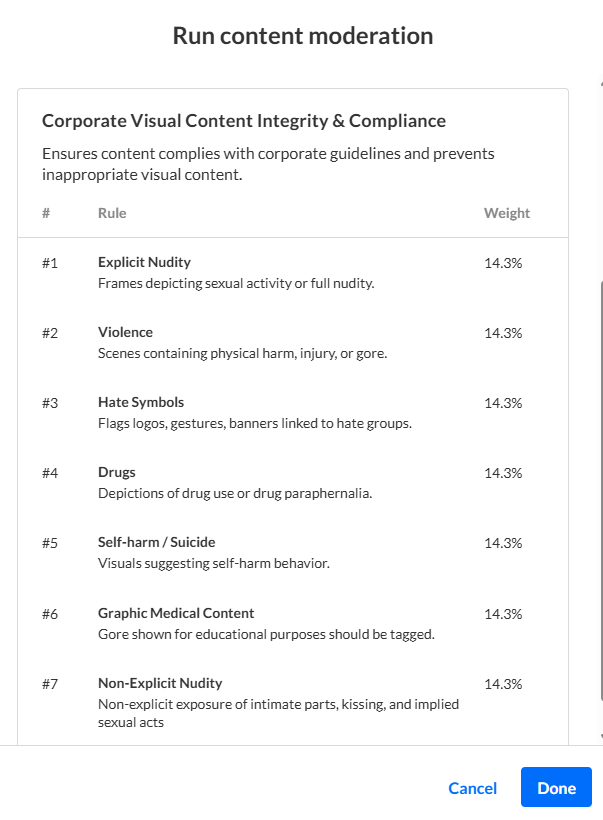 Content is evaluated against moderation policies, either Kaltura’s default policies or your organization’s customized guidelines. Visual and verbal moderation are evaluated separately and each requires its own policy.