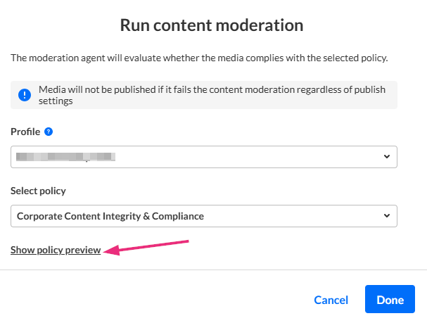 When configuring the Run content moderation action, you can click Show policy preview to see what the selected policy checks for.