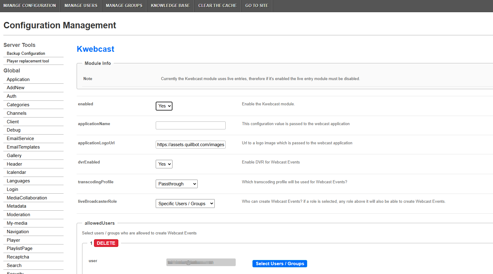 1. Go to your Configuration Management page, and click the Kwebcast module. You can also navigate directly using a link: https://{your_KMS_URL}/admin/config/tab/kwebcast.