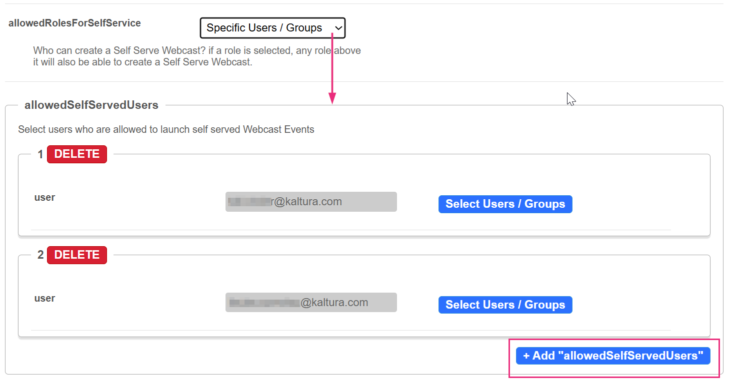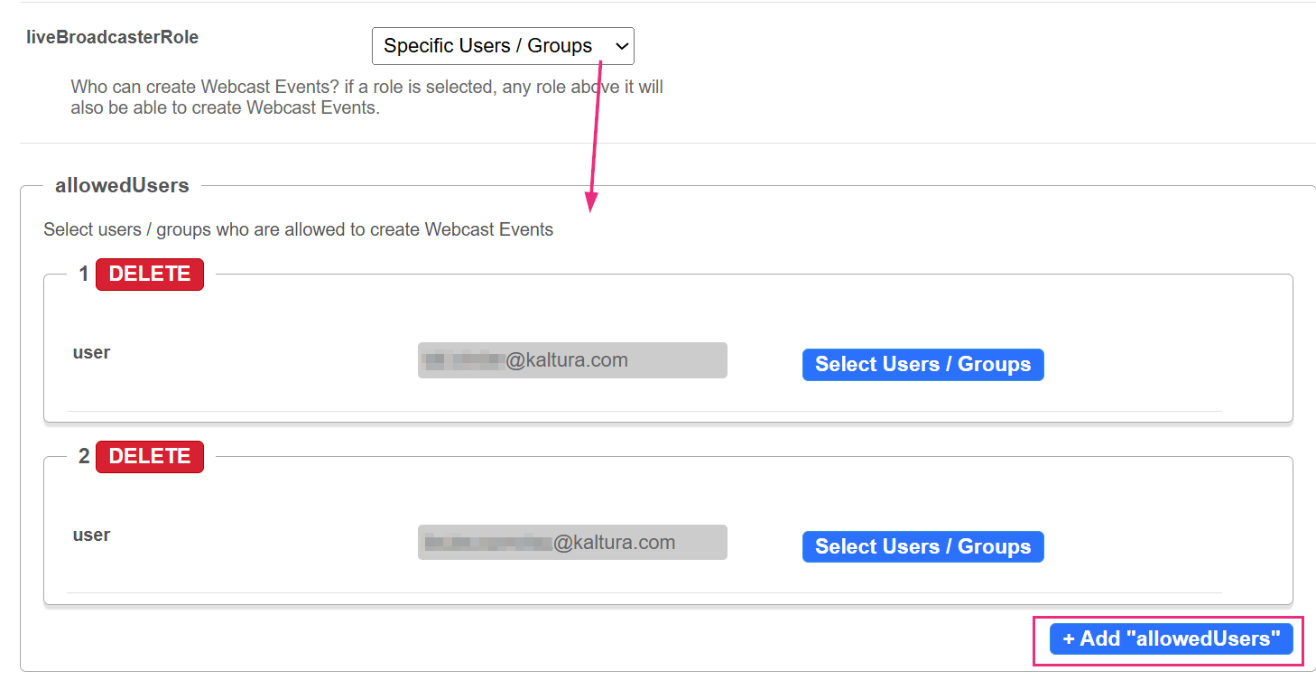 allowedVideoConferenceIntegrationUsers - Select users who are allowed to launch video conference integrations from Webcast events. Click +Add "allowedVideoConferenceIntegrationUsers ", then click Select Users/Groups and type in the username or ID. Click Submit. Repeat for multiple users.
