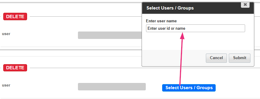 Click Select Users/Groups. Start typing a name, select it, and click Submit. Repeat to add more.