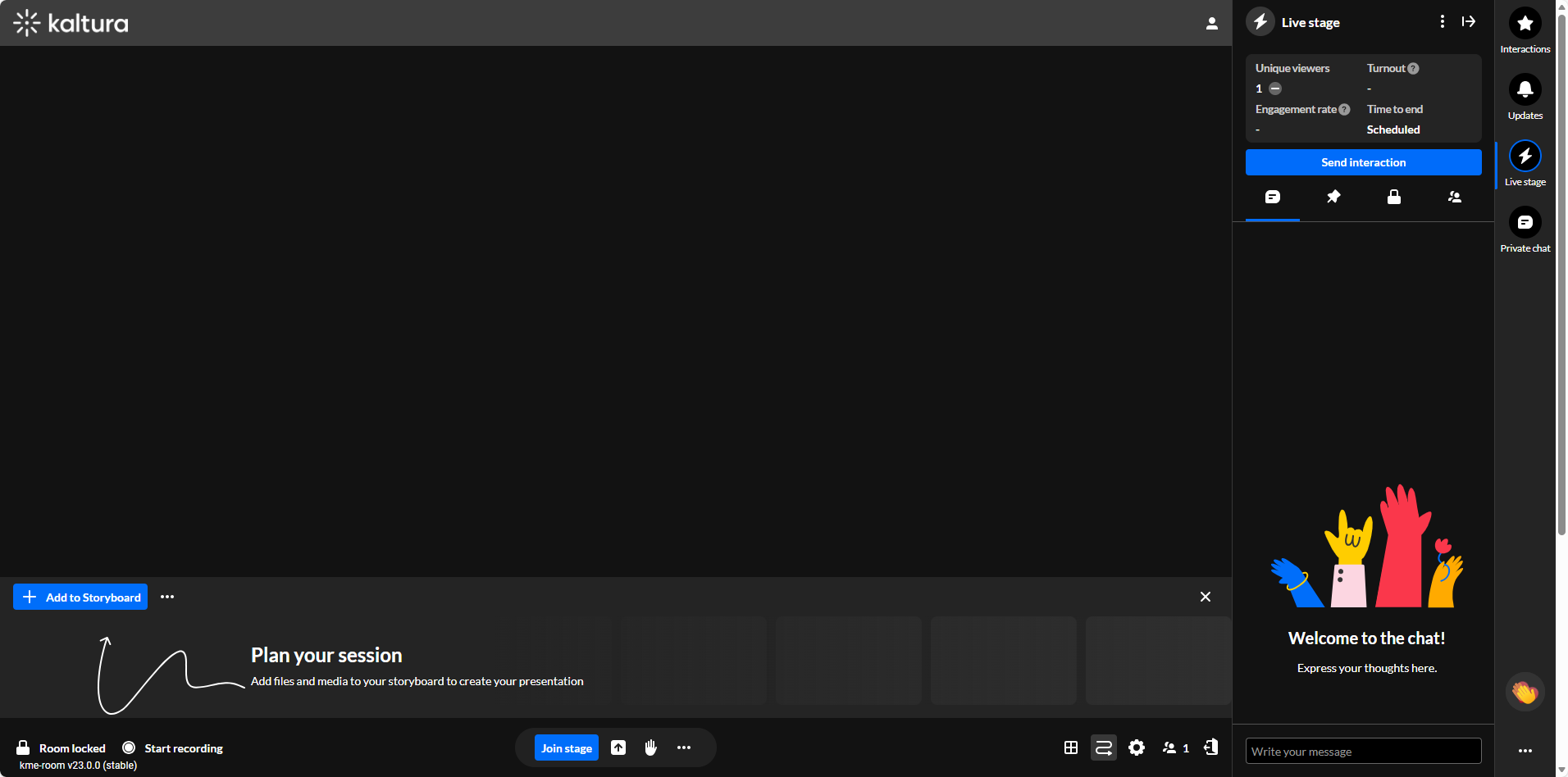 This article describes how to launch an Interactive Room session in Events and enter the Kaltura Room.